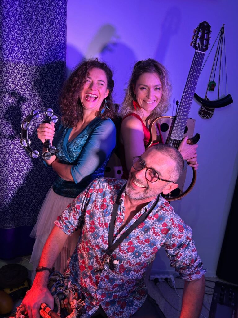 À la guitare et au chant, une voix chaleureuse qui porte les mélodies avec sensibilité. À ses côtés, une chanteuse percussionniste, dont la présence rythmique et la voix claire apportent éclat et vivacité. Enfin, un percussionniste émérite, véritable maître des pulsations, qui colore chaque morceau d’une richesse sonore unique.
